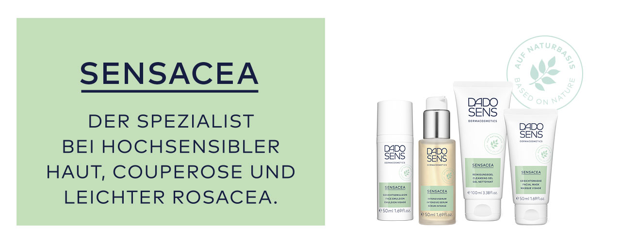 SENSACEA umsorgt hypersensible Haut mit speziell verträglicher Pflege. Denn wenn die Haut zu Couperose bis hin zu ersten Anzeichen zu Rosacea neigt, sich also sichtbar und spürbar rötet und leicht gereizt reagiert, bedarf sie einer ganz fein abgestimmten Spezialpflege. Die besonders milden und sanften Produkte von SENSACEA werden auch im Rahmen einer therapiebegleitenden Pflege bei leichter Rosacea vertragen. Sie stärken die Haut und spenden wohltuende Feuchtigkeit.